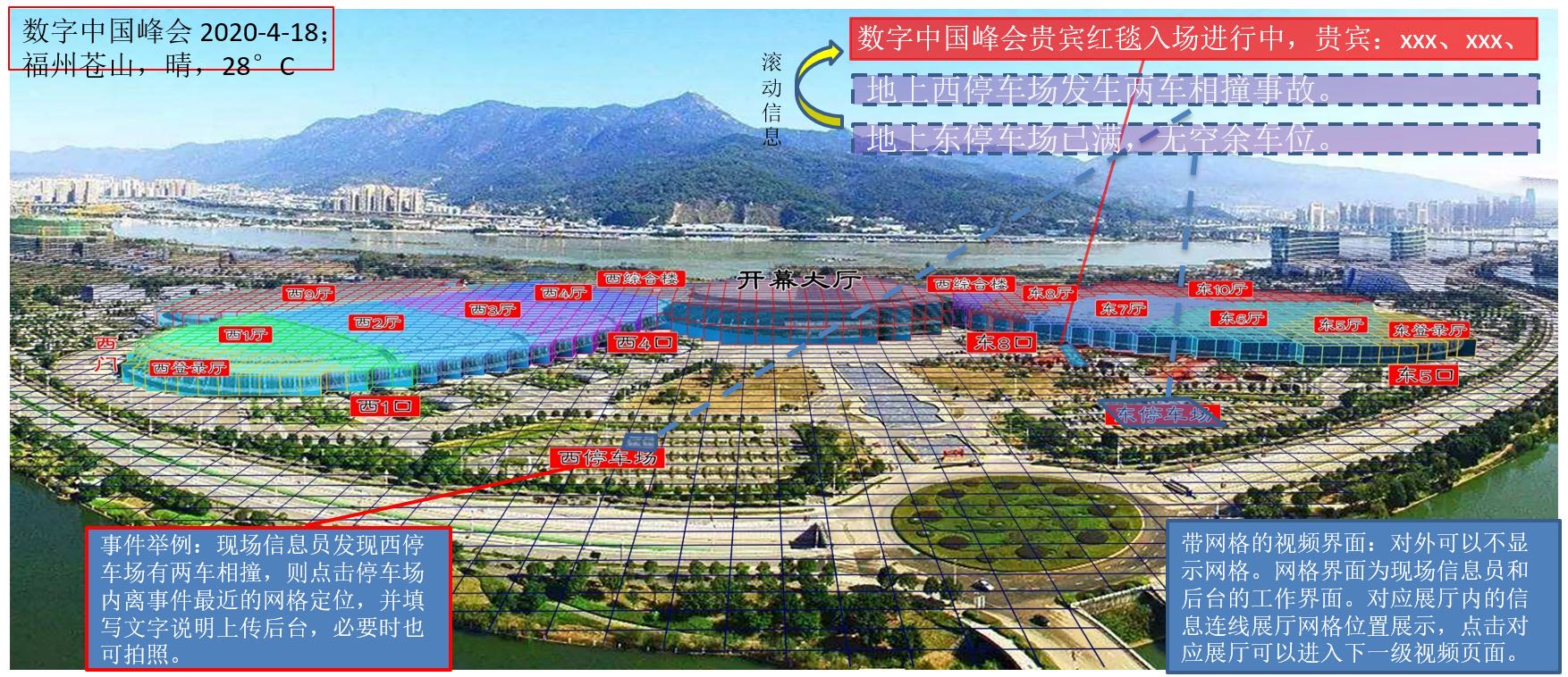 通過給福州倉山海峽會展中心安裝多個高位攝像頭,利用北斗網(wǎng)格編碼和三維網(wǎng)格立體建模技術(shù),實現(xiàn)視頻內(nèi)容空間感知、快速定位、高效管理、多源數(shù)據(jù)協(xié)同分析能力的視頻網(wǎng)格化管理系統(tǒng),滿足跨鏡頭跟蹤、人群趨勢分析等應(yīng)用需求,從而快速、高效地實現(xiàn)會展中心視頻監(jiān)控智能管理、重點區(qū)域安全態(tài)勢感知及實時指揮,提升會展中心安防管控能力和應(yīng)急事件響應(yīng)能力。